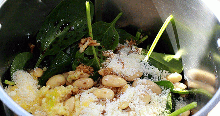 Migdały namoczyć na kilka godzin. Razem z pozostałymi składnikami wrzucić do blendera i zmiksować na gładką masę. Pesto szpinakowe świetnie pasuje do tostów, grzanek i pizzy. Dodane do makaronu czy ryżu będzie smacznym pomysłem na wiosenny obiad czy kolację.