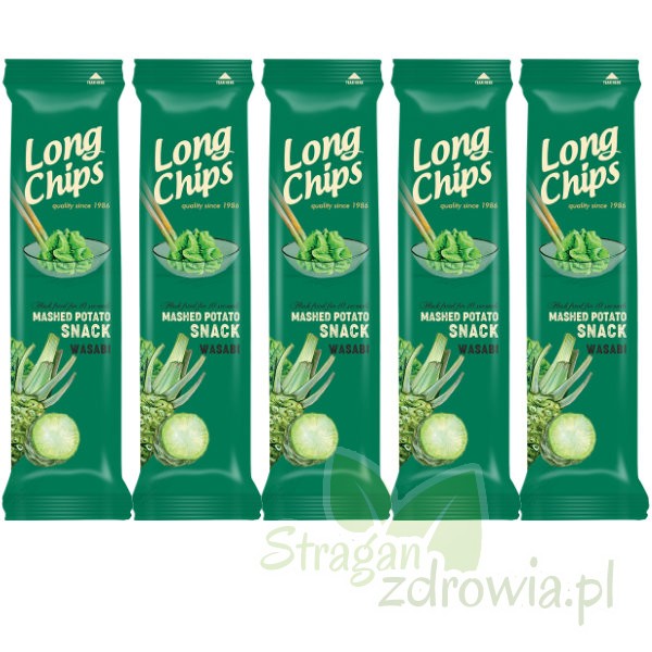 Long Chips Wasabi to wyjątkowe przekąski ziemniaczane. Smażone w wysokiej jakości oleju rzepakowym tylko przez 10 sekund, przez co są niesamowicie chrupkie i nie są tak tłuste jak klasyczne chipsy. Long Chips mają oryginalny kształt - są długie, płaskie i bardzo cienkie. Umieszczone w tacce, aby nie uległy zniszczeniu. Są dostępne w starannie dobranych smakach.