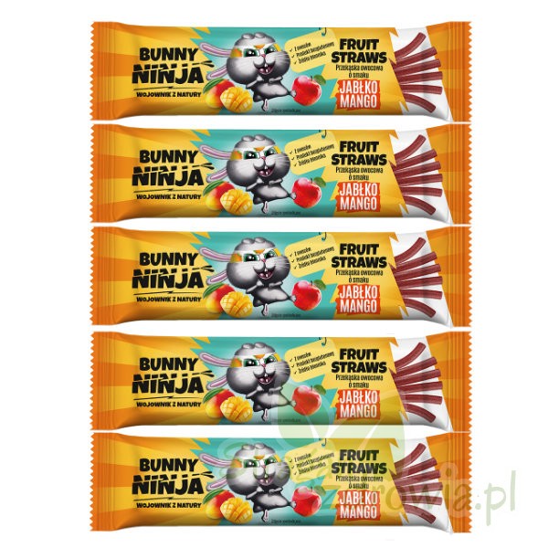 Bunny Ninja Fruit Straws o smaku jabłka i mango to długie, cienkie sznureczki nasycone owocowym smakiem. Pyszne smakołyki powstają na bazie owoców bez udziału tradycyjnego cukru. Długie owocowe przekąski nie tylko wyśmienicie smakują, ale też są pretekstem do świetnej zabawy sensorycznej, zachęcając najmłodszych do sięgania po owoce. Sześć złączonych ze sobą Fruit Straws można rozrywać i dzielić się owocową słodkością z najbliższymi, dostarczając wszystkim ogrom radości. W naszych słodkich przekąskach została użyta naturalna pektyna, która odpowiada za ich sprężystą strukturę. Wysoki, kolorowy display zwraca uwagę i pomieści aż 18 owocowych przekąsek.