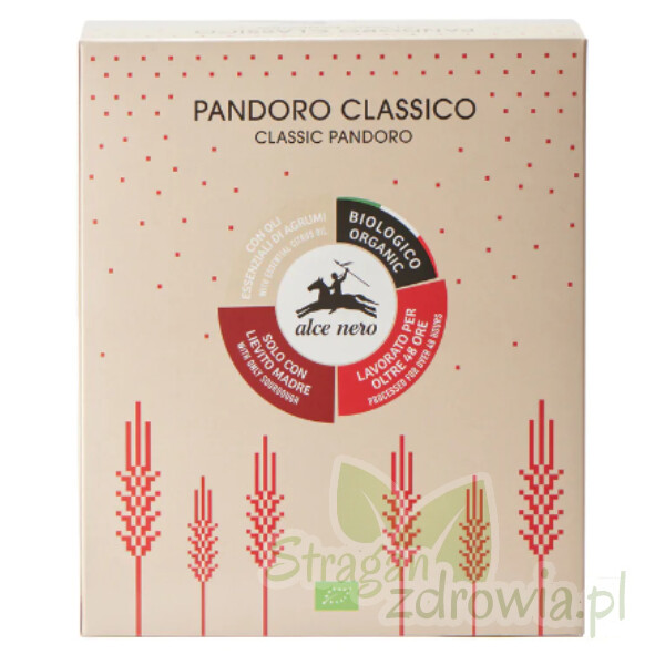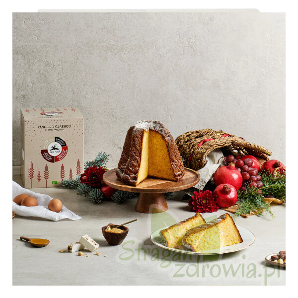 Najwyższej jakości klasyczne ciasto Pandoro (pan d'oro), czyli drożdżowa babka waniliowa na naturalnym zakwasie o kształcie ośmiokątnej piramidy. Ciasto o żółto-złotej barwie i regularnej strukturze. Na zewnątrz intensywnie złocista. W opakowaniu saszetka cukru pudru do posypania babki. Tradycyjna babka bożonarodzeniowa, która powstała w Weronie. Zgodnie ze swoją nazwą pan d'oro oznacza "złoty chleb’" co odnosi się do złotych liści, które dekorowały ciasto podawane na bankietach w Weronie za czasów Republiki Weneckiej.