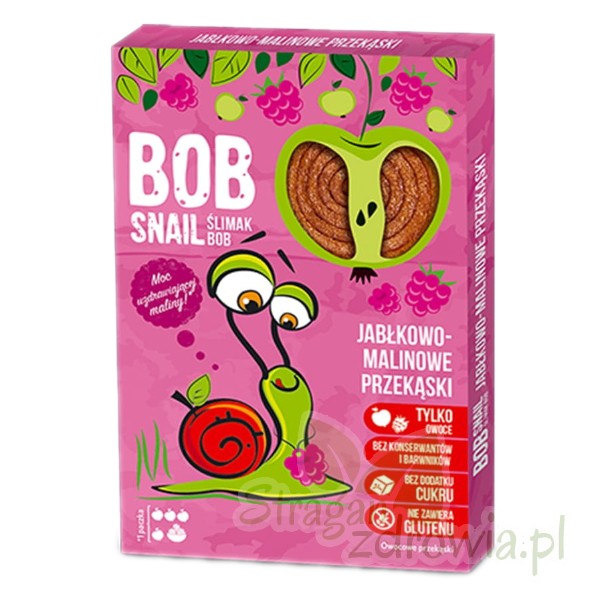 Ślimaki Bob to naturalne cukierki owocowe, do ich przygotowania wykorzystano tylko owoce i nic więcej. Przekąska jabłkowo-malinowa składa się w 100% z jabłek i malin. Jabłka są źródłem cennego błonnika pokarmowego, który usprawnia pracę przewodu pokarmowego. Ponadto, jabłka zawierają w swoim składzie kwas ursolowy, składniki mineralne (potas, magnez, żelazo, krzem i wapń), kwercetyne, a w pestkach znajduje się witamina B17. Maliny są bogatym źródłem polifenoli, pośród których dominują: elagotaniny oraz antocyjany. Dodatkowo w swoim składzie zawierają kwasy organiczne w tym fenolowe oraz flawonole.