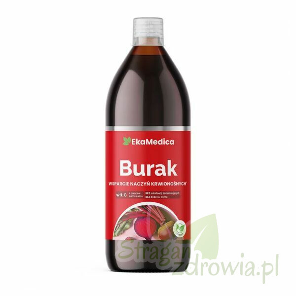 Eka Burak EkaMedica– suplement diety w formie płynnej, wyprodukowany z soku 100% z bulw buraków ćwikłowych dodatkiem witaminy C naturalnego pochodzenia. Pasteryzowany.