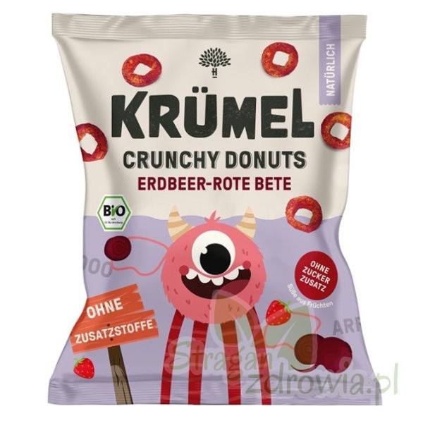 Ekologiczne chrupki kukurydziane w kształcie kółek o smaku truskawkowo- buraczkowym.