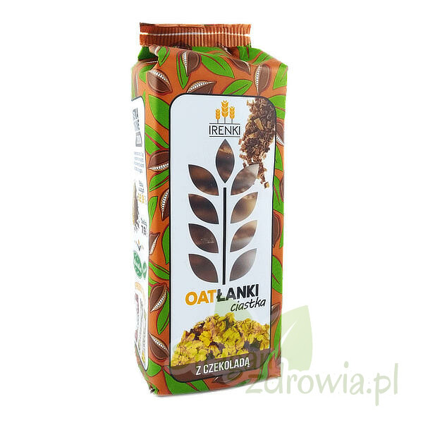 Irenki to Ciastka bez mąki, w 100% na bazie płatków zbożowych. Naturalne, bez emulgatorów, regulatorów i konserwantów oraz z bogactwem witamin i minerałów. Czekoladowe ciastka na bazie pełnoziarnistych płatków owsianych. Owies to supergwiazda wśród zbóż. To miano zawdzięcza zwartości znaczących ilości białka i beta-glukanów. Ważną cechą β-glukanów są ich właściwości probiotyczne tzn. jest on pożywką dla korzystnych bakterii znajdujących się w jelitach, które doprowadzają β-glukan do częściowego rozpadu do kwasów organicznych, tj.: kwas octowy, butyrylowy oraz propionowy. Kwas butyrylowy pobudza układ odpornościowy jelita grubego. Dodatkowo β-glukany wpływają na zmniejszenie poziomu cholesterolu w surowicy krwi. Dodatkowo są naturalnym źródłem witaminy B1, witaminy E, magnezu i cynku oraz prawdziwa skarbnica manganu.