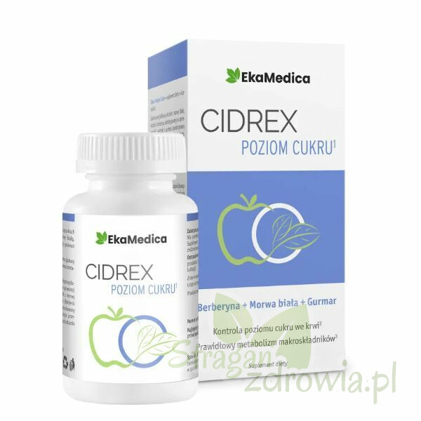 Cidrex Poziom Cukru – suplement diety w kapsułkach zawierający sproszkowany ocet jabłkowy, ekstrakt z morwy białej, ekstrakt z berberysu standaryzowany na berberynę HCL, ekstrakt z gurmaru standaryzowany na kwasy gymnemowe, cynamon oraz chrom.
