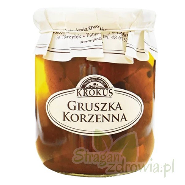 Gruszka korzenna to całe połówki gruszek w zalewie z octu, cynamonu i goździków. Produkt pasteryzowany.