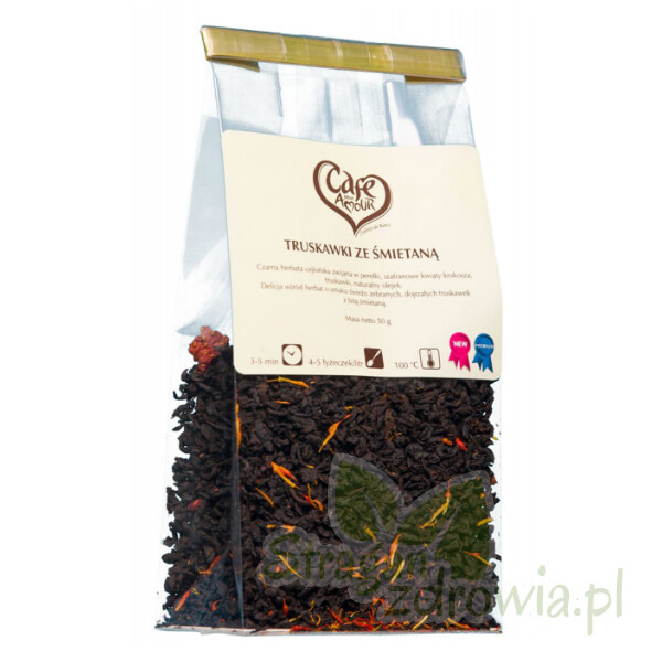 Herbata czarna Truskawki ze śmietaną 50g marki Cafe Mon Amour to Delicja wśród herbat o smaku świeżo zebranych, dojrzałych truskawek z bitą śmietaną.