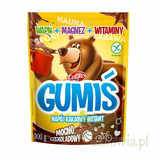 Celiko to polska firma zajmująca się produkcją certyfikowanych produktów bezglutenowych od 1982 roku. Kakao rozpuszczalne GUMIŚ wyróżnia się mocno czekoladowym smakiem i aromatem oraz doskonałą rozpuszczalnością w ciepłym, jak i chłodnym mleku. Jest wzbogacany: wapniem, magnezem i witaminami. Certyfikowany produkt bezglutenowy.