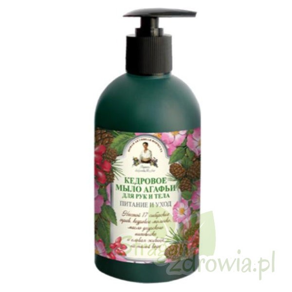 Producent Eurobiolab, marka Babuszka Agafia to kosmetyki pochodzące z dodatkiem ziół do codziennej pielęgnacji. Cedrowe mydło Agafii przygotowane na bazie naturalnego mleczka cedrowego, olejków z dzikiej róży i sosnowych igieł, dokładnie oczyszcza skórę rąk i ciała, delikatnie ją pielęgnując. Cedrowe mleczko i olejek z sosnowych igieł – unikalne dary przyrody, od najdawniejszych czasów cenione były za swoje prozdrowotne i antybakteryjne właściwości. Wchodzące w skład mydła organiczne składniki i ekstrakty z 17 syberyjskich ziół, zebranych w ekologicznie czystych regionach Ałtaju, przenoszą w świat tajgi, otulają aromatami ziół i kwiatów, odżywiają i uspokajają. Używając jagodowego mydła Agafii poczujesz dobroczynne działanie dawnych, uzdrawiających receptur.