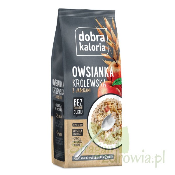 Dobra Kaloria tworzy produkty pełnowartościowe, smaczne i ze składników pochodzących z natury. Owsianka królewska to doskonała propozycja na pożywne śniadanie lub kolację. Wewnątrz torebki znajduje się mieszanka płatków owsianych, ekspandowanych nasion amarantusa i pysznych jabłek. Owies zawiera znaczące ilości białka i beta-glukanów. Ważną cechą β-glukanów są ich właściwości probiotyczne. Dodatkowo wpływają na zmniejszenie poziomu cholesterolu w surowicy krwi. Owsianki Królewskiej nie trzeba jej gotować, a jedynie zalać gorącą wodą lub mlekiem (może być vege), zamieszać i rozkoszować się wartościowym posiłkiem.