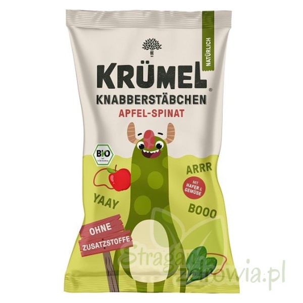 Ekologiczne paluszki zbożowe o smaku jabłko-szpinak dla dzieci od 3 roku życia.