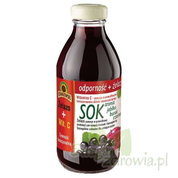 Sok z aronii, jabłek, buraczków ćwikłowych i marchwi, wzbogacony witaminą C i żelazem, bezglutenowy. Produkt pasteryzowany. Przed użyciem wstrząsnąć butelką.