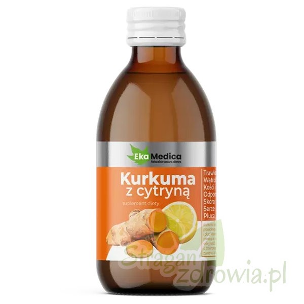 Kurkuma z cytryną - płynny suplement diety zawierający sok 100% z kłączy kurkumy i owoców z dodatkiem ekstraktu z kłączy kurkumy. Pasteryzowany.