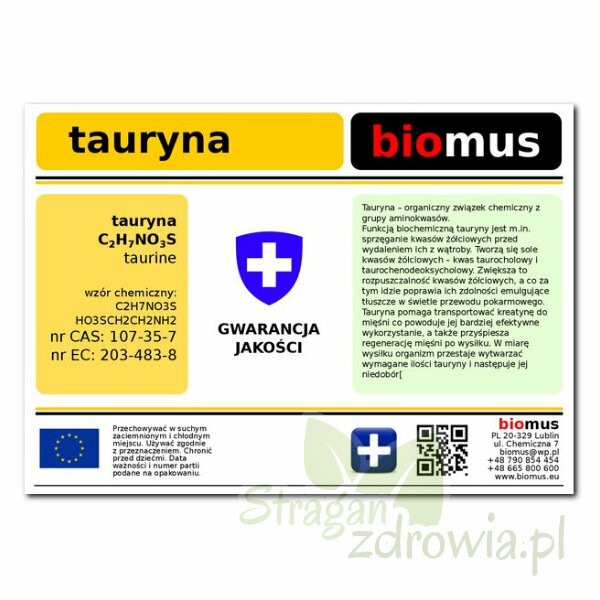 Biomus Tauryna to najwyższej jakości czysta tauryna w formie proszku. Tauryna to aminokwas niezbędny do prawidłowego funkcjonowania organizmu. W organizmie człowieka znajdziemy ją w mózgu, sercu, nerkach oraz tkance mięśniowej.