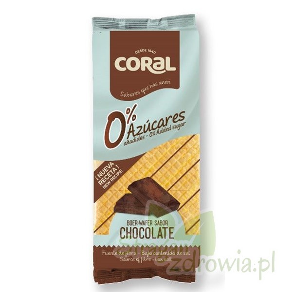 Wafle z kremem kakaowym bez dodatku cukru. Zawierają naturalnie występujące cukry. Odpowiednie dla osób na diecie bezcukrowej.