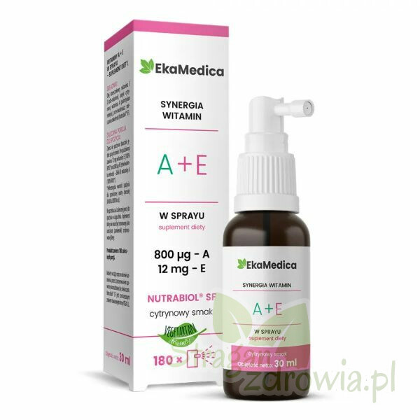 Synergia witamin A + E w sprayu z wyjątkową formułą Nutrabiol® SF – suplement diety. Zawiera witaminę E naturalnego pochodzenia pozyskaną z oleju słonecznikowego.